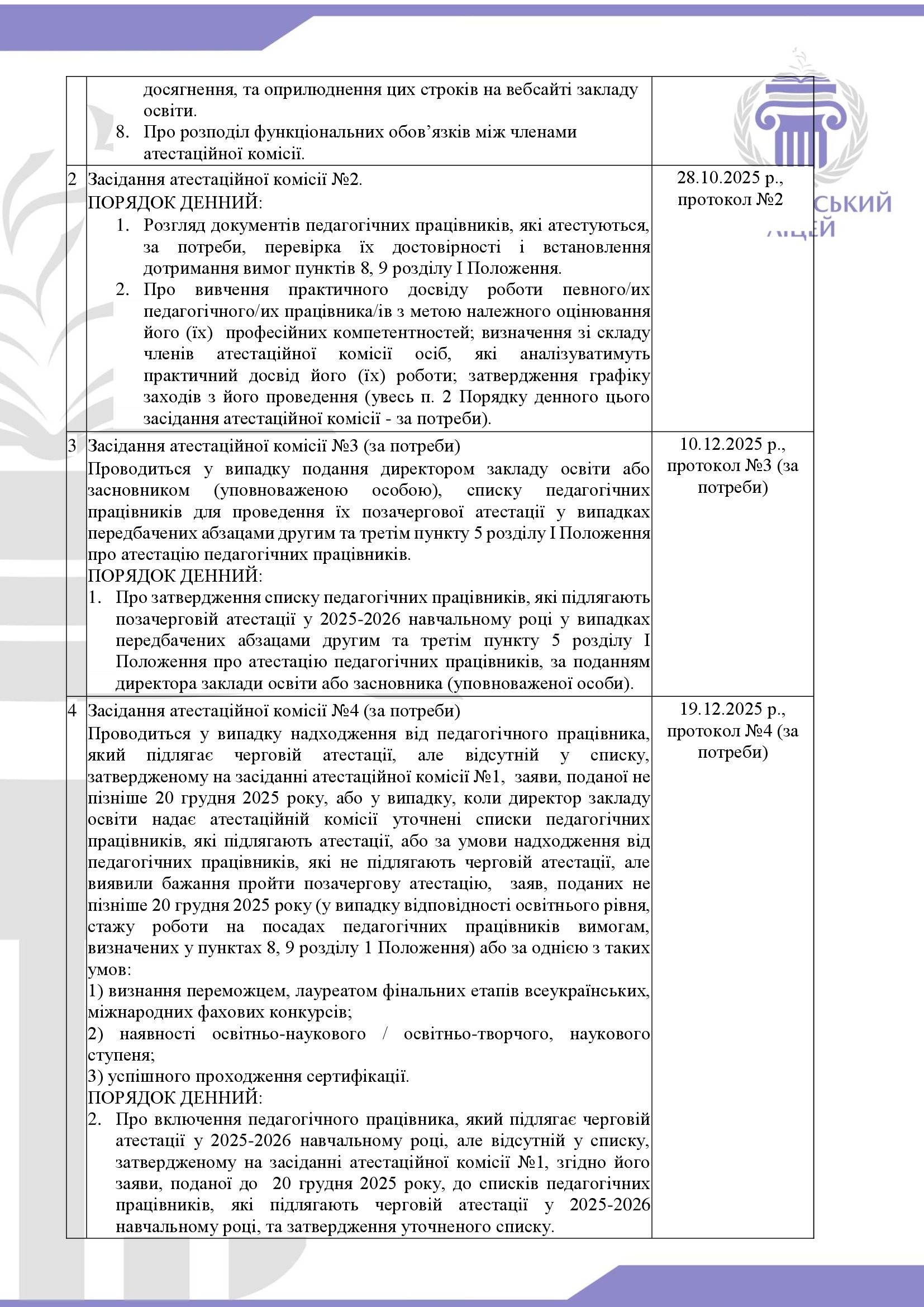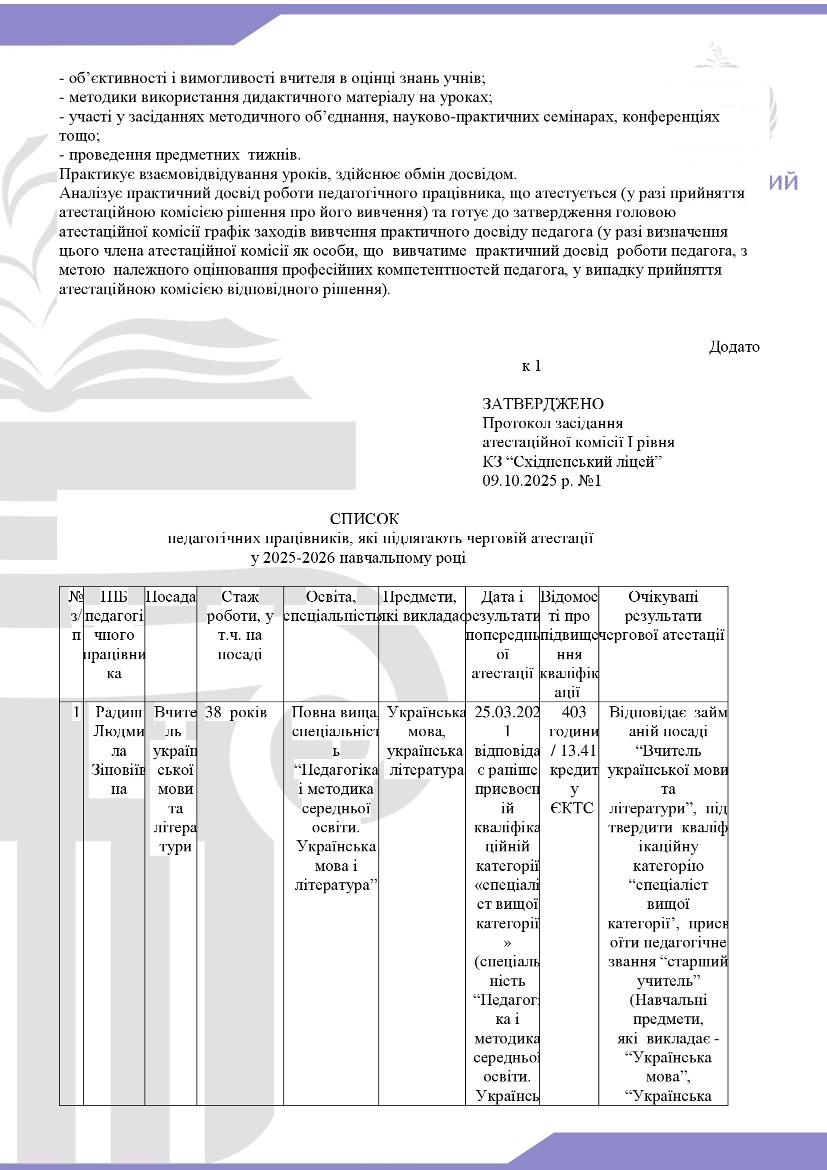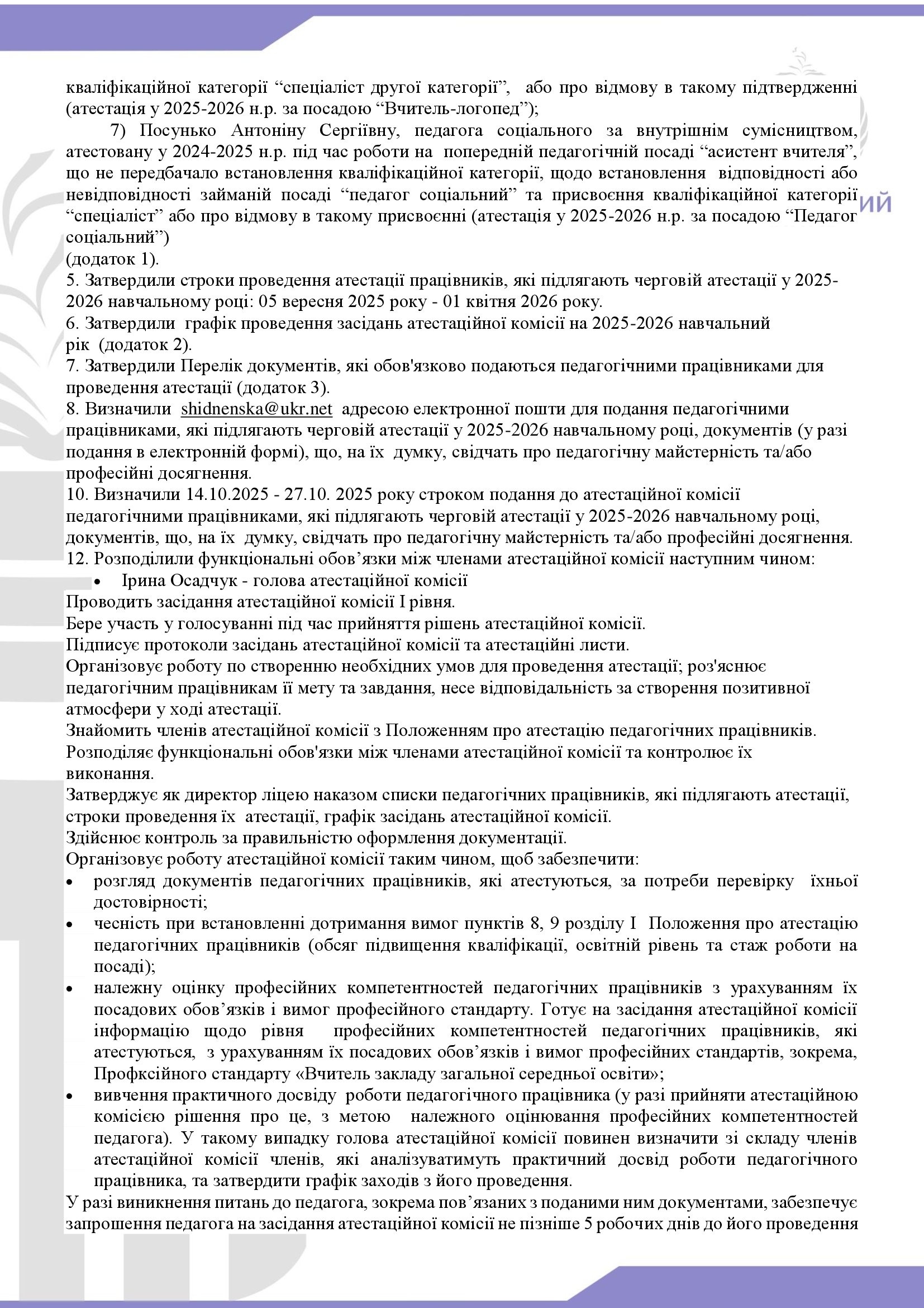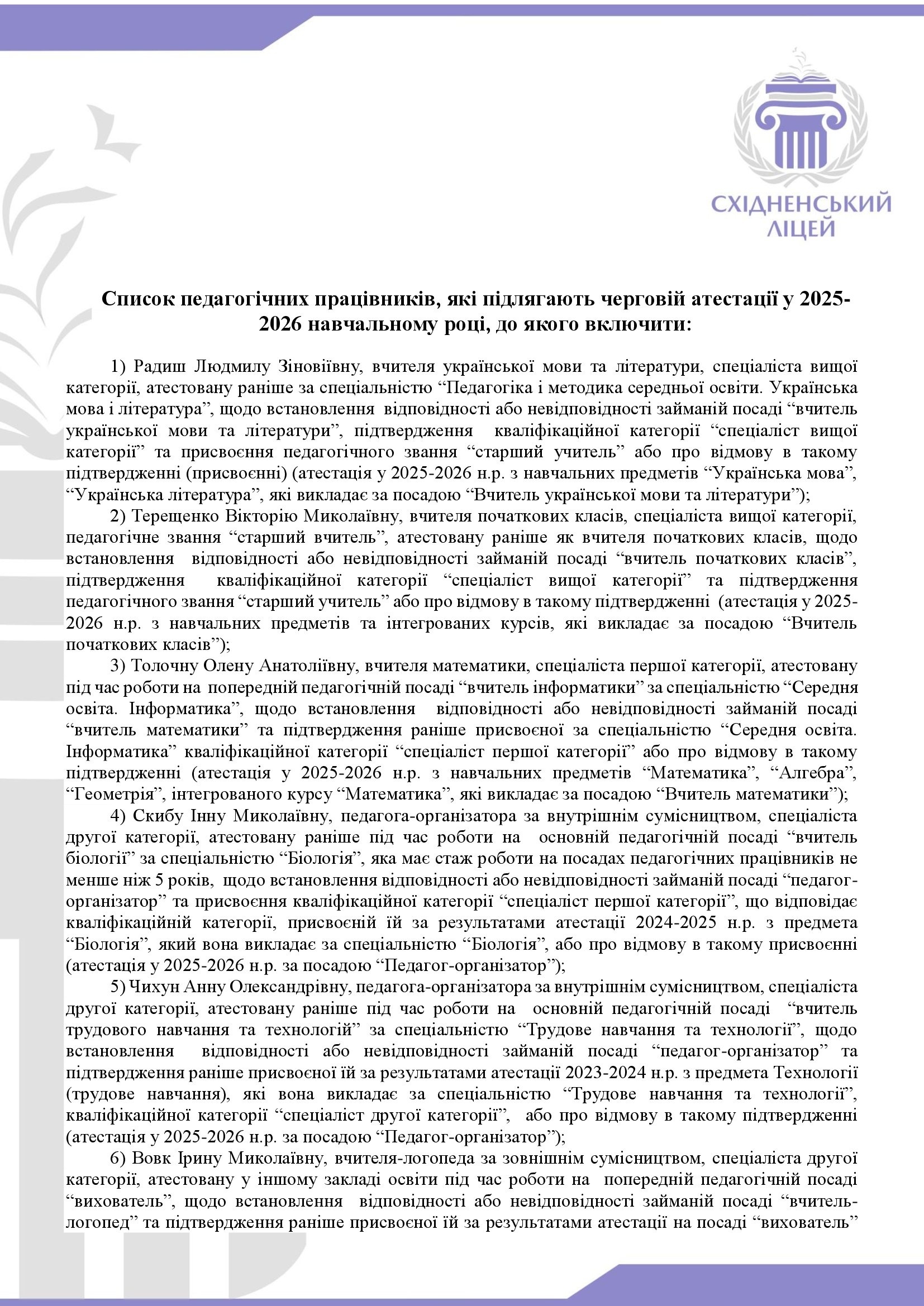 Список педагогічних працівників, які підлягають черговій атестації у 2025-2026 навчальному році